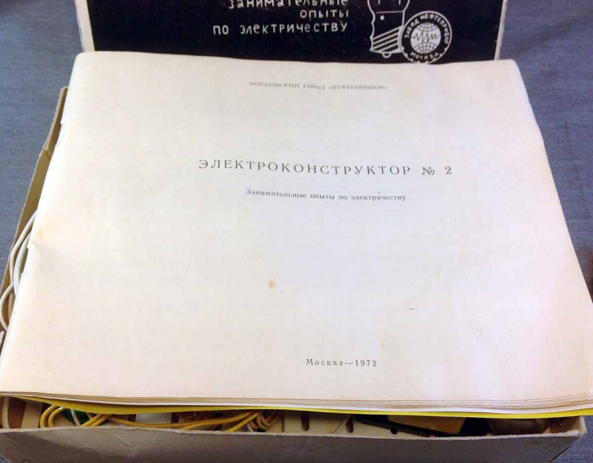 "Электроконструктор № 2" Занимательные опыты по электричеству выпускался предположительно с 1972 года Московским заводом "Нефтеприбор". Занимательные опыты по электричеству для любознательных.