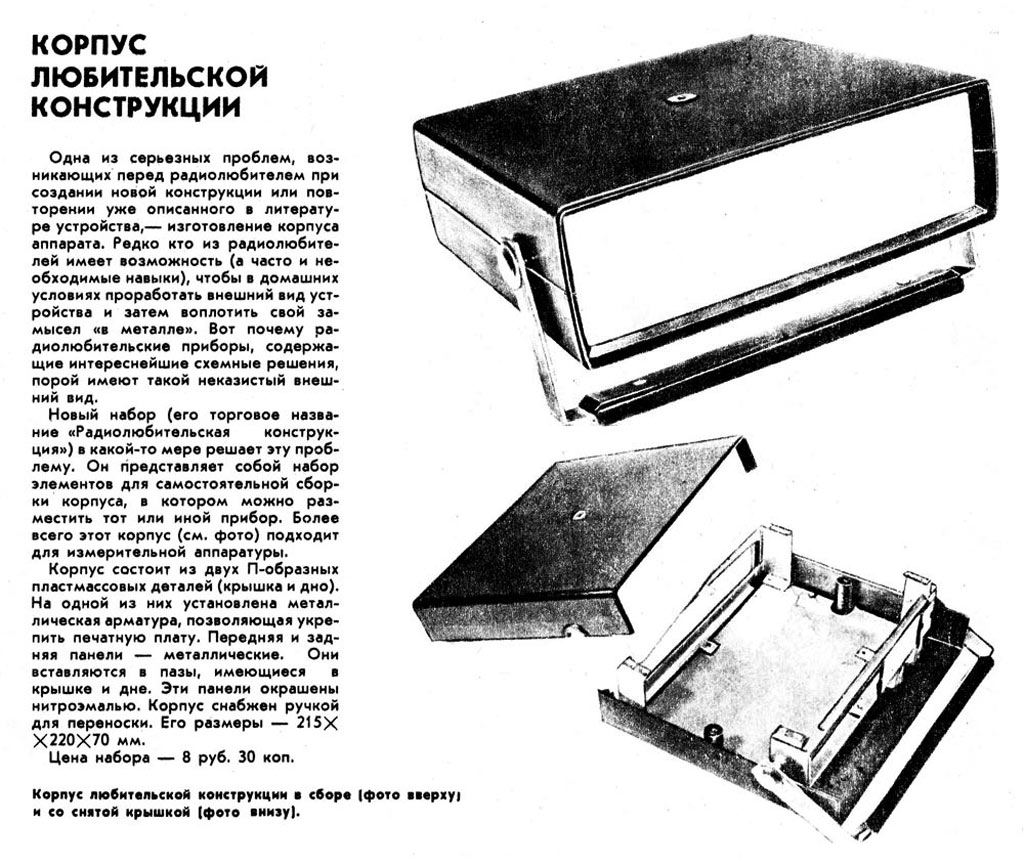 Корпус "Радиолюбительская конструкция" выпускался возможно с 1983 года. Предназначен для сборки приборов или радиолюбительских конструкций.