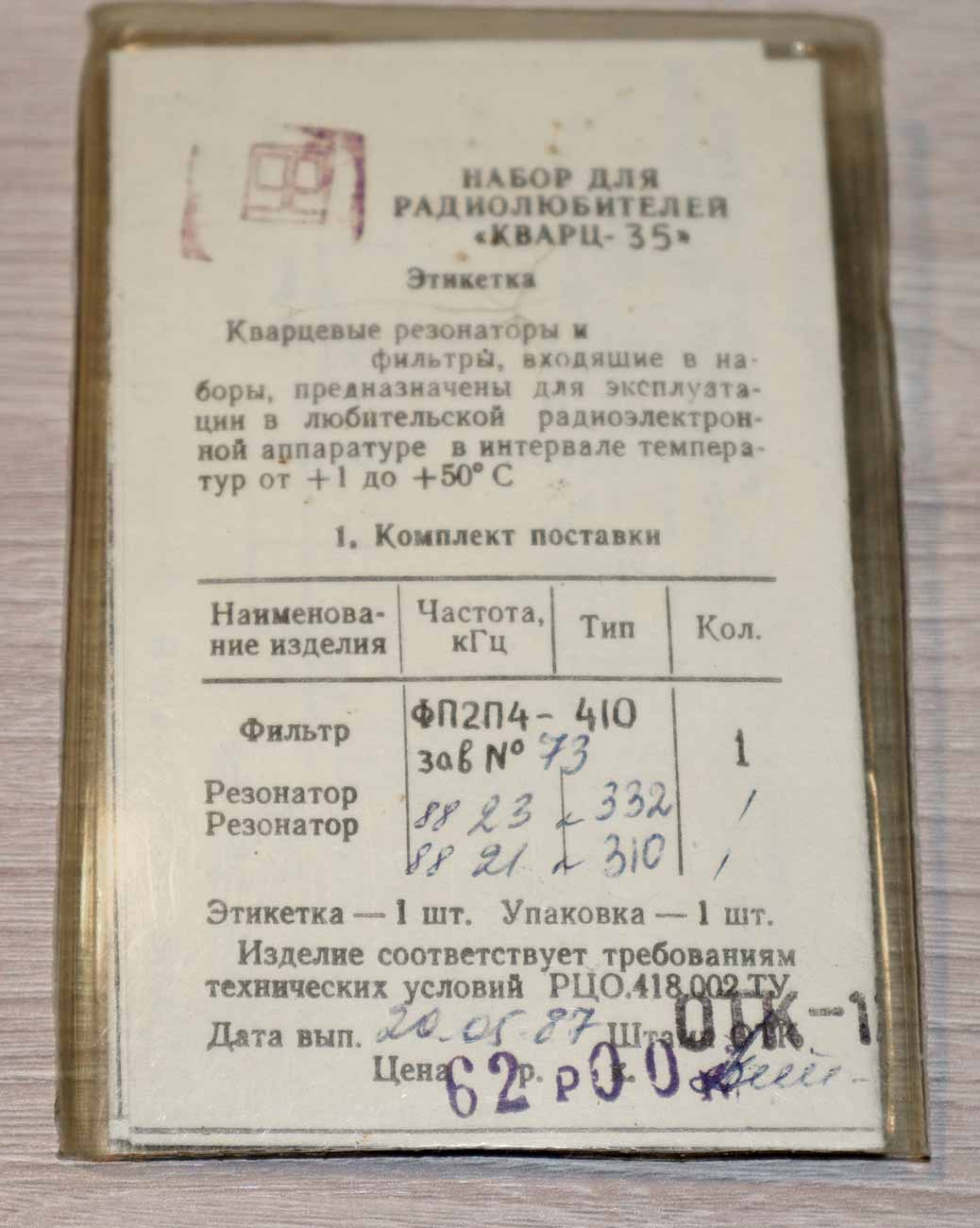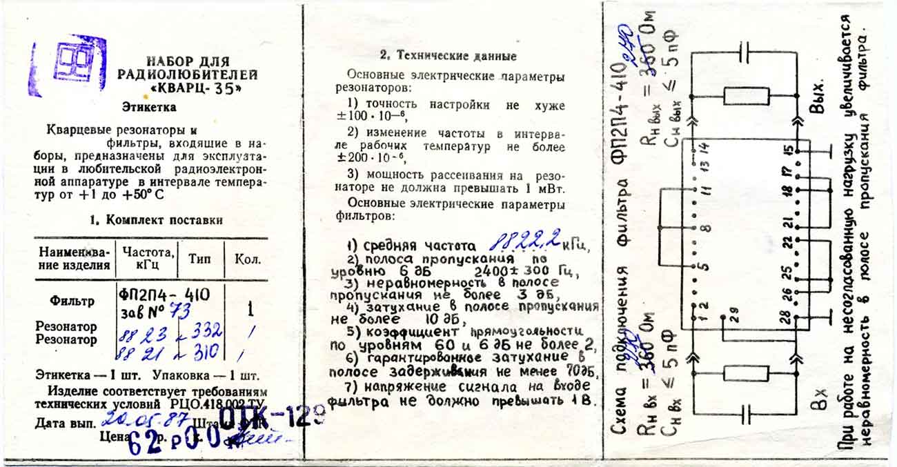 Набор для радиолюбителей "Кварц-35" производился возможно с 1987 года. Является фильтром ПЧ на частоту 8822,2 кГц и полосу 2400Гц.