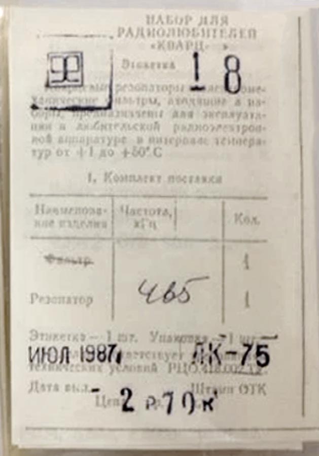 Набор для радиолюбителя "Кварц-18" выпускался возможно с 1987 года. Содержит кварц на 465 кГц. Цена 2 руб. 70 коп.
