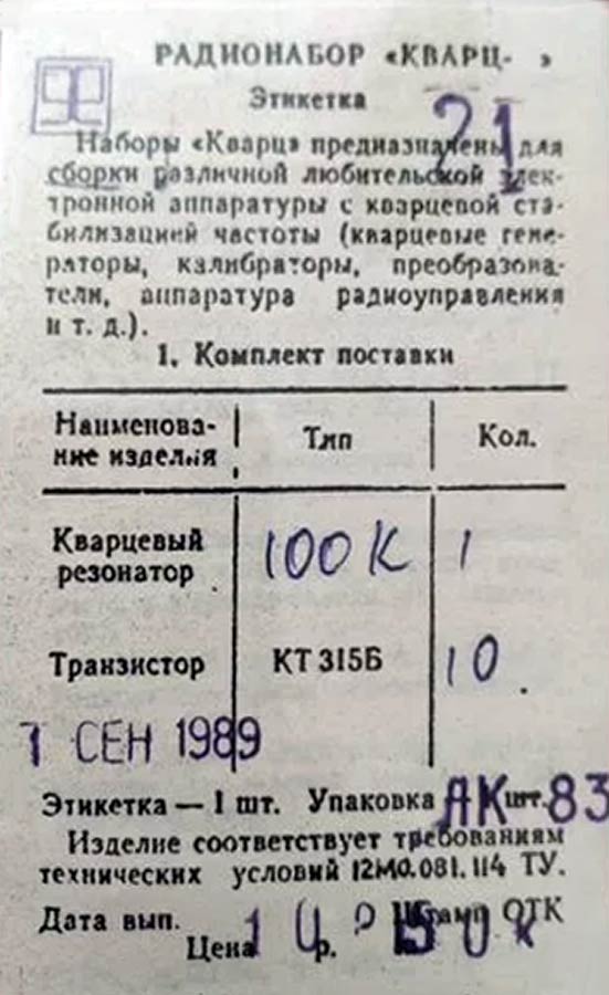 Радионабор "Кварц-21" выпускался возможно с 1986 года. В наборе кварц на 100 кГц и транзисторы КТ315Б.