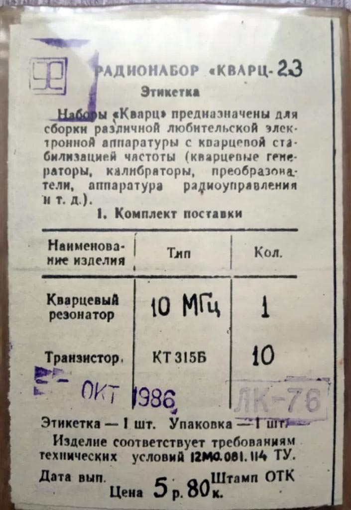 Радионабор "Кварц-23" выпускался предположительно с 1986 года и предположительно Ленинградским заводом имени Козицкого.