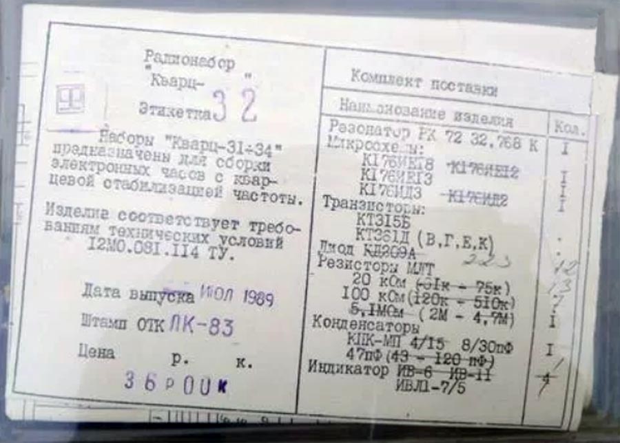 Радионабор "Кварц-32" выпускался возможно с 1987 года. Предназначен для сборки электронных часов с кварцевой стабилизацией частоты. Материал подготовил Владимир Степанович Шумский, Москва.
