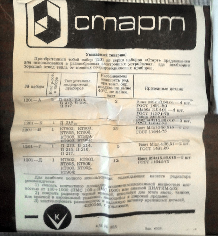 завод. В наборе один радиатор для охлаждения мощных транзисторов и крепёжные