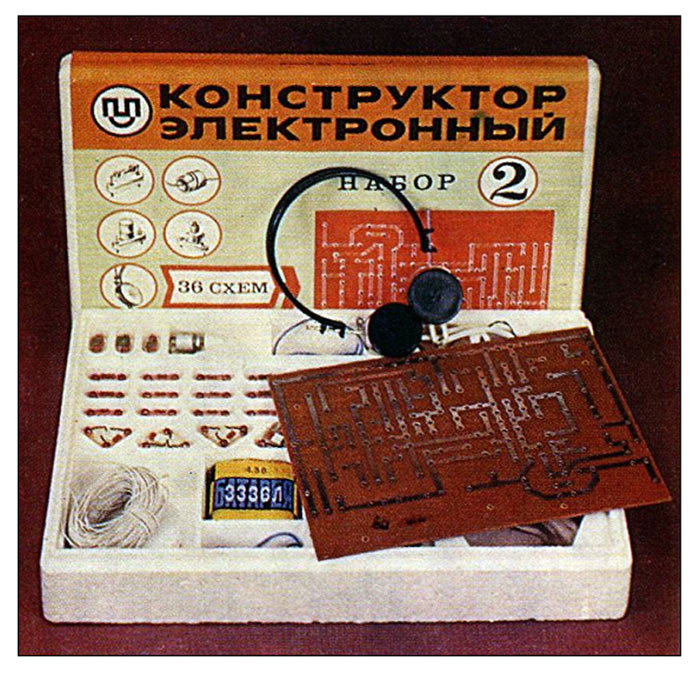 Конструктор электронный (Набор 2) выпускался предположительно с 1981 года. Набор Позволяет собрать 36 интегральных схем различных устройств.