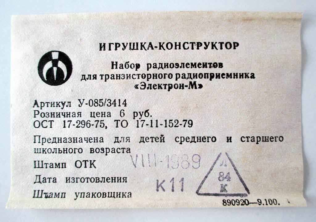 "Крона". Цена радиоконструктора 6 руб. Набор выпускался заводом до первой