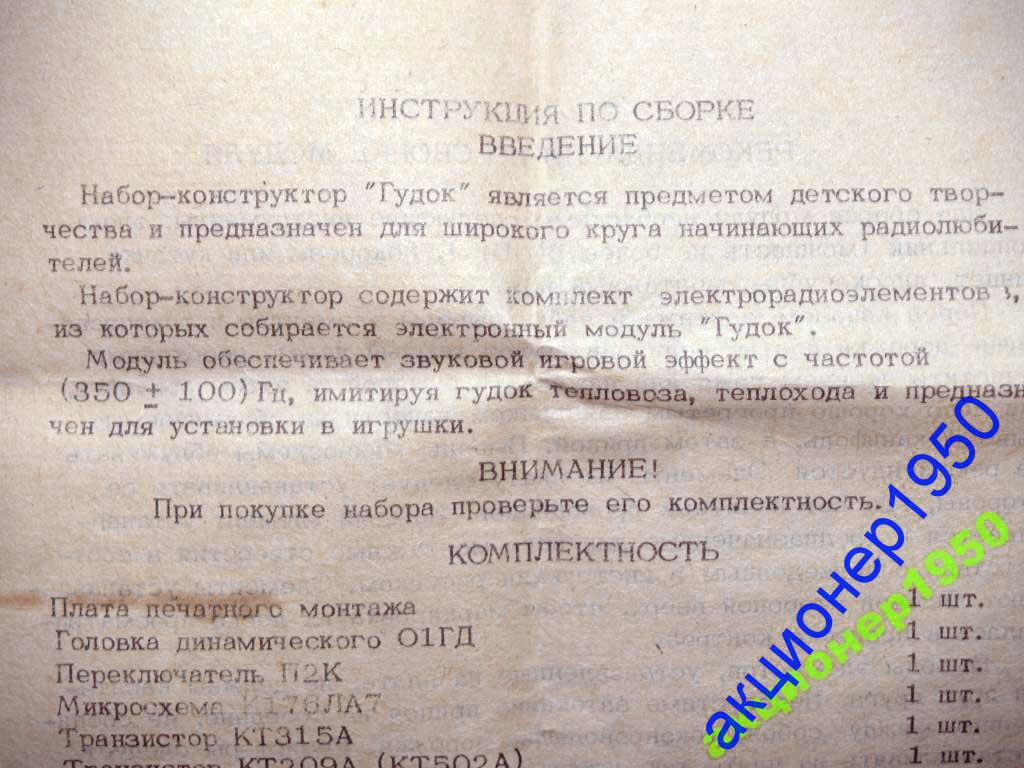 Набор-конструктор "Гудок" с 1990 года выпускал Куйбышевский приборостроительный завод. Предназначен для сборки генератора, имитирующий гудок теплохода и тепловоза.
