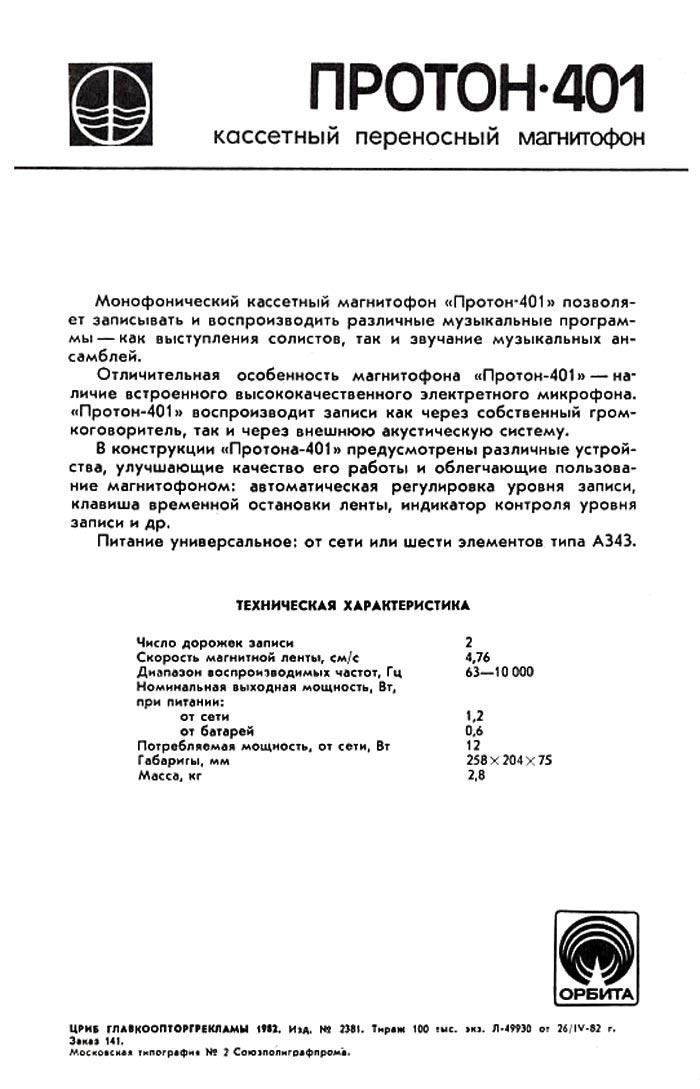 Описание магнитофона "Протон-401" в справочнике