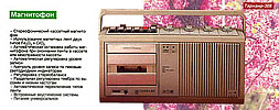 365х183х85 мм. Вес без батарей 3 кг. Цена модели 168 рублей. Магнитофоны