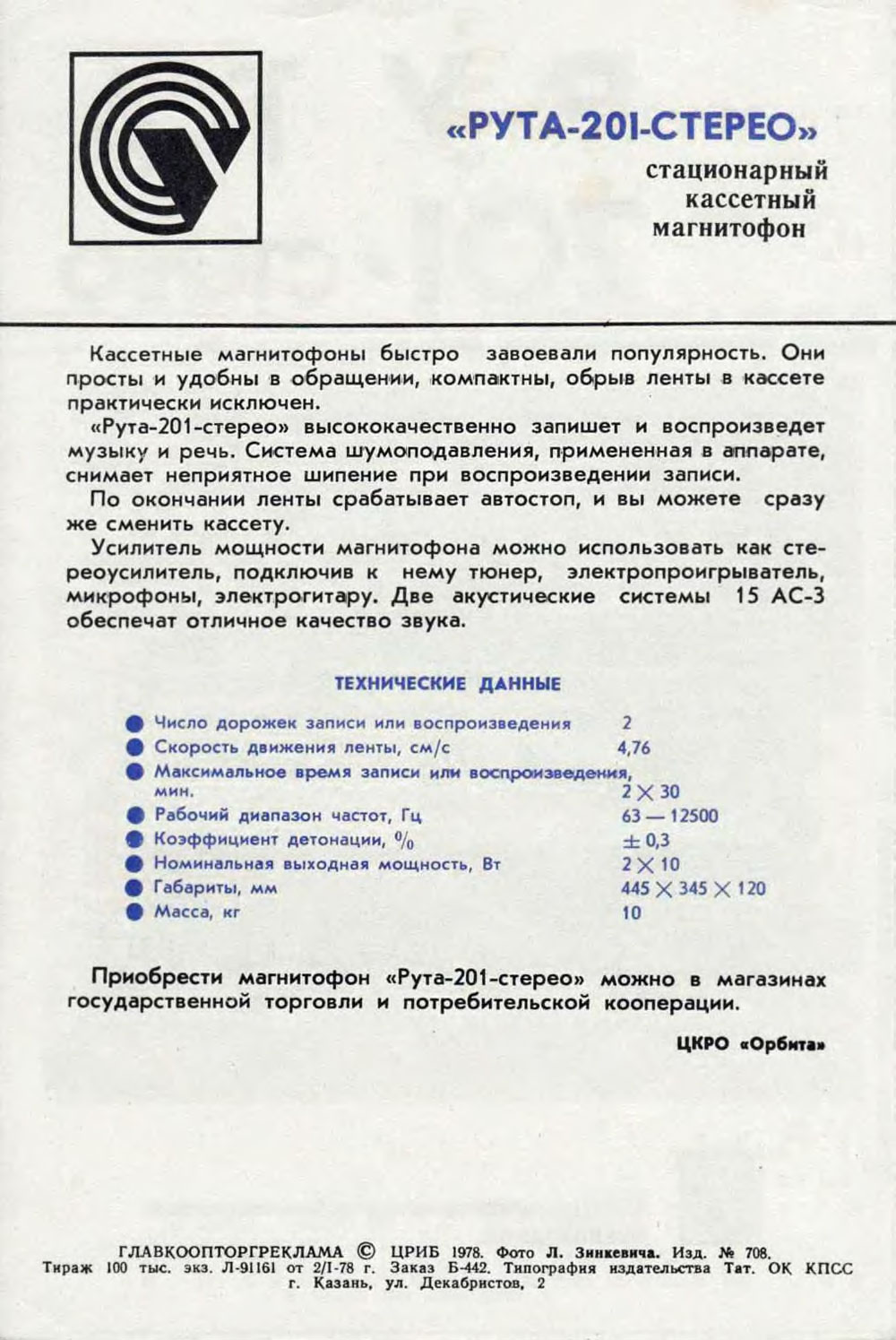 ПСЗ "Вильма". Магнитофон 2-го класса "Рута-201-стерео" предназначен для