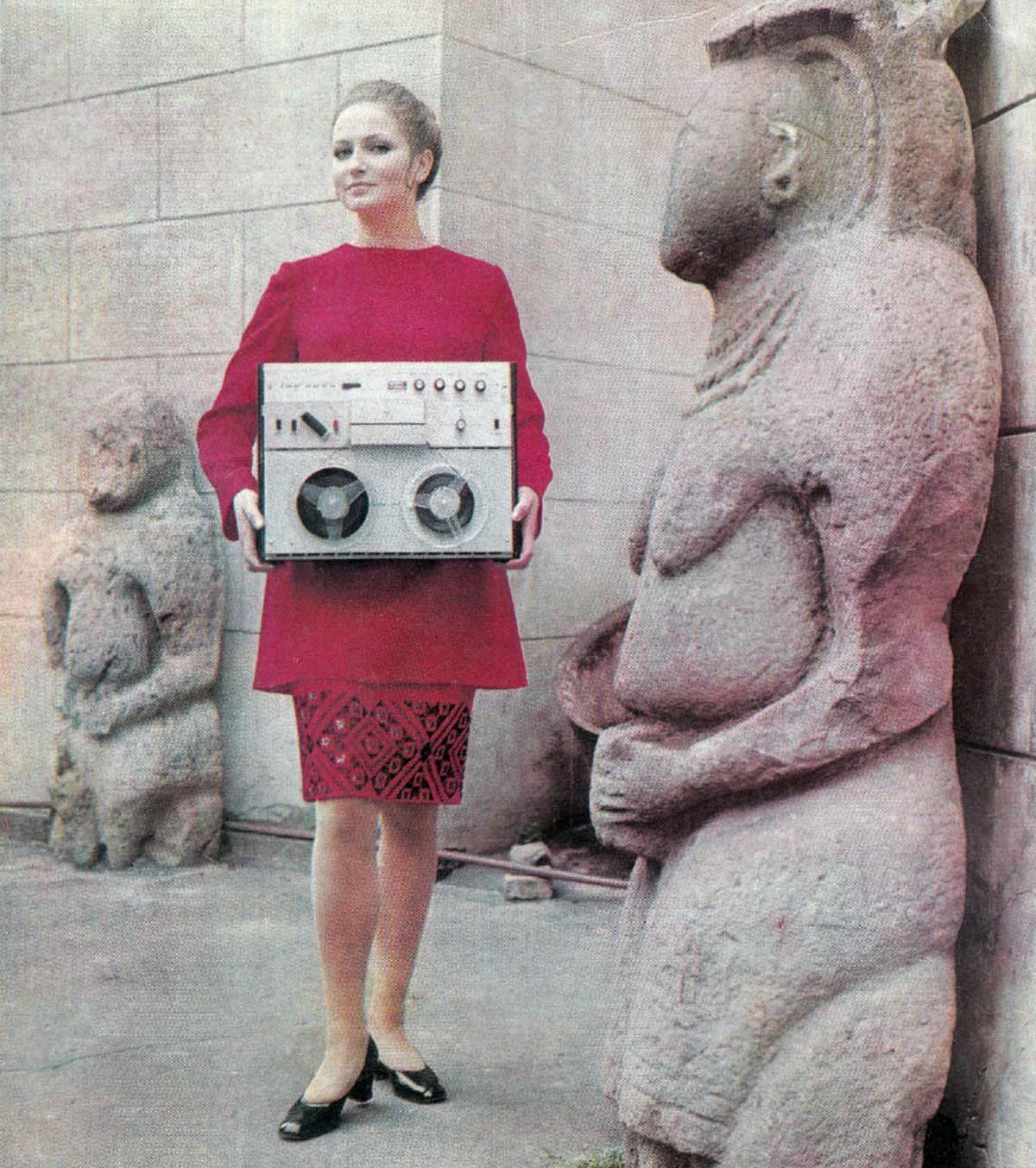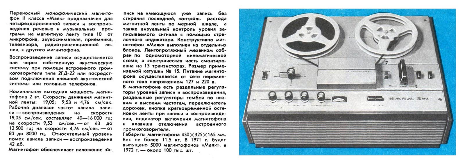 165 мм. Масса - 11,5 кг. Первые магнитофоны выпускали из пластмассы, без