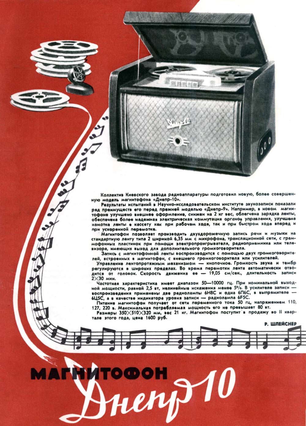 магнитофон "Днепр-10" с 1958 года выпускал Киевский завод радиоаппаратуры.