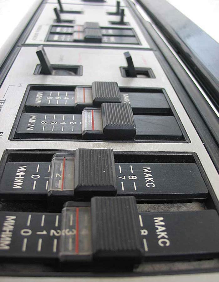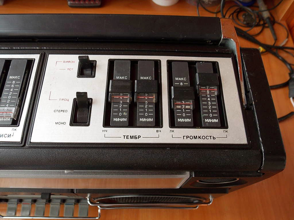 счетчик метража ленты, электретные микрофоны, стрелочные индикаторы уровня