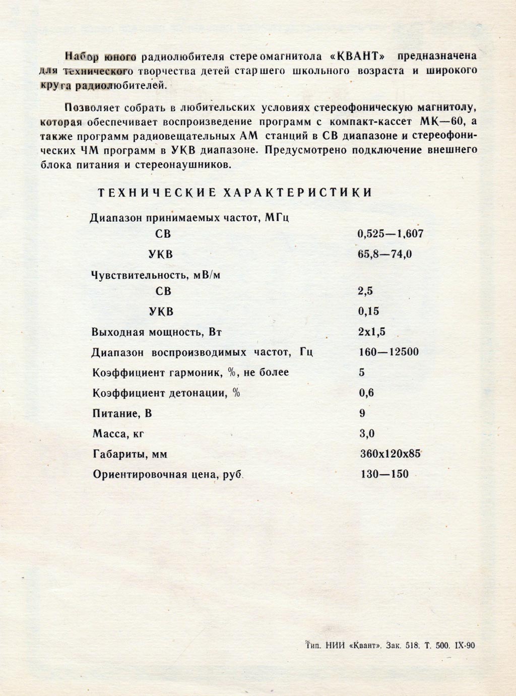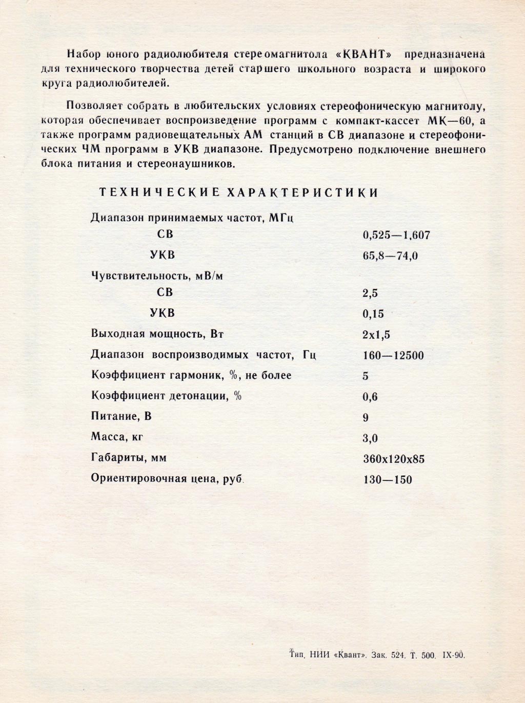 магнитола "Квант" в виде набора для юного радиолюбителя была подготовлена