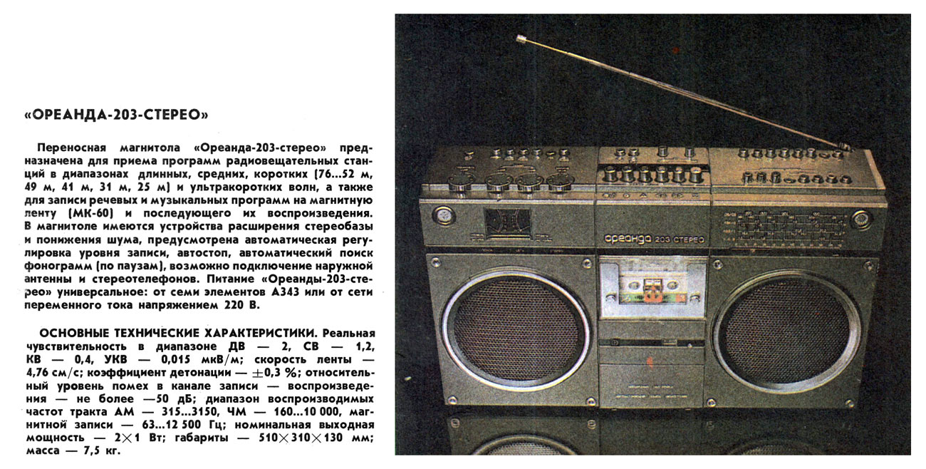 мощность 2х1 Вт; размеры 510х310х130 мм; масса 7,5 кг. С 1988 года магнитола