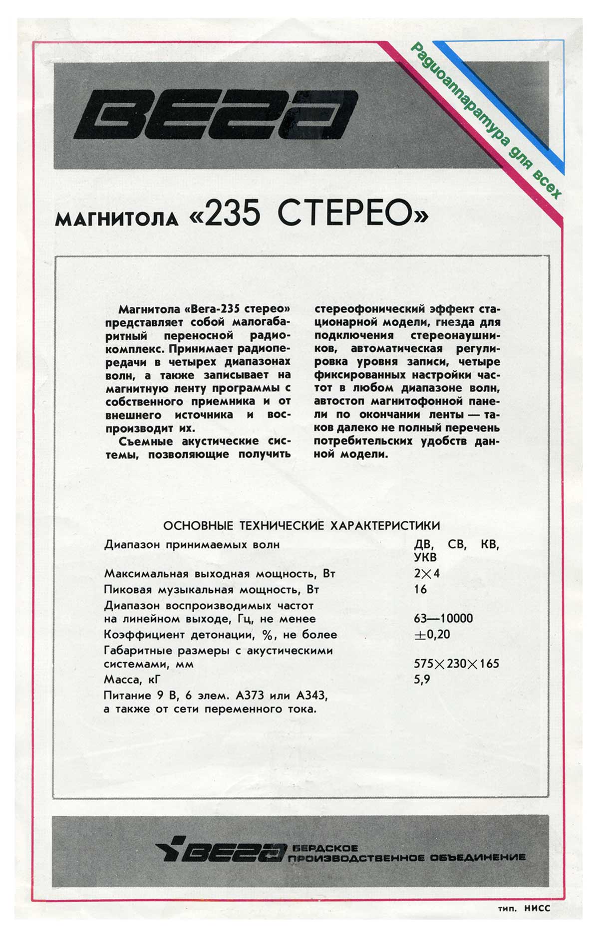 мм, масса с батареями 7 кг. Магнитола "Вега РМ-235С-1" отличается применением