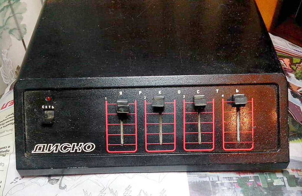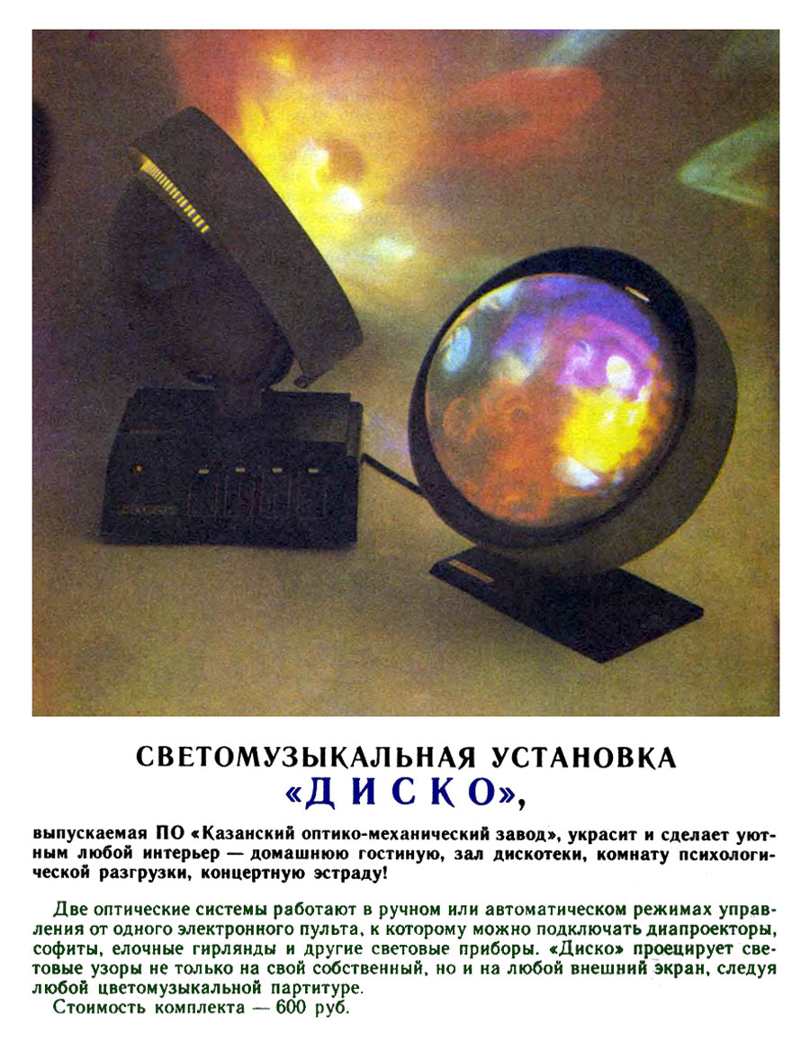 Светомузыкальная установка "Диско" выпускалась предположительно с 1989 года ПО "Казанский оптико-механический завод". Информация в рекламе.