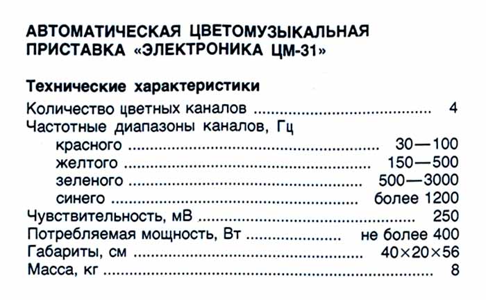 Автоматичская цветомузыкальная приставка "Электроника ЦМ-31" выпускалась с 1986 года предположительно Саратовским ПО "Радуга". Питание - 220 В. Каналов - 4. Потребляемая мощность - 100 Вт на канал.