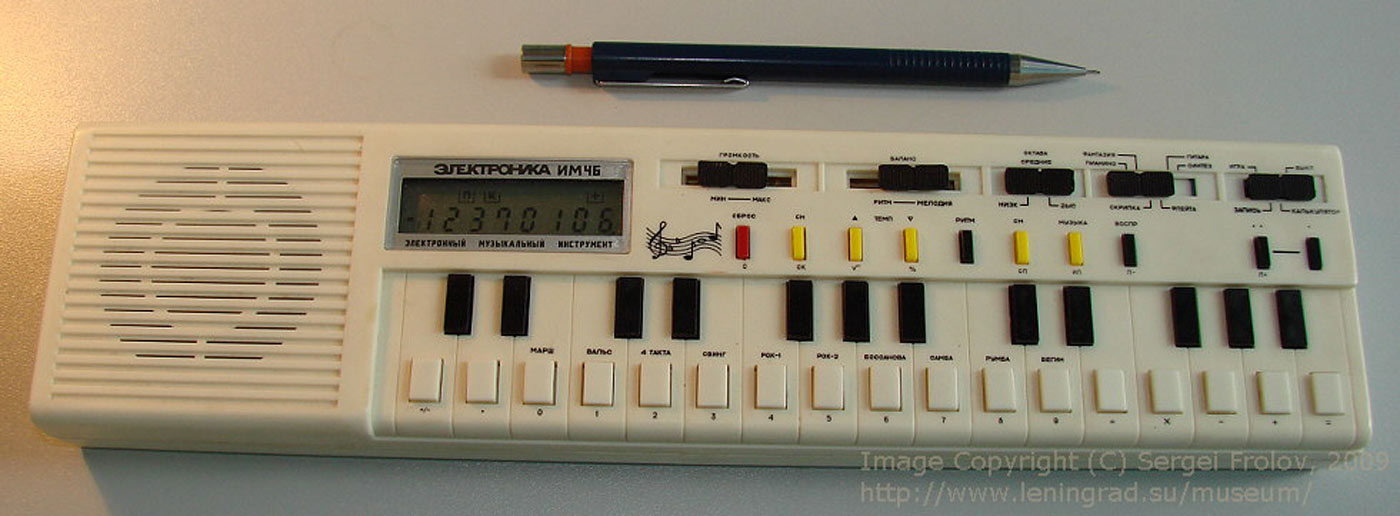 Электронный музыкальный инструмент "Электроника ИМ-46" выпускался с 1994 года. Электронный синтезатор с калькулятором "Электроника ИМ-46" имеет возможности: калькулятора; отображения играемых нот; изменения октавы; регулировки баланса звука; установки темпа; синтезатора нот; памяти на 100 нот. Инструменты ЭМИ: пианино; фантазия; виолончель; гитара; синтез. Ритмы: марш; вальс; 4-такта; свинг; рок-1; рок-2; боссанова; самба; румба; бегин.