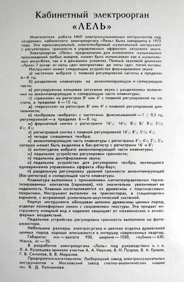 Кабинетный электроорган "Лель" (разработка 1973 года), выпускали предположительно с 1974 года Люберецким заводом электромузыкальных инструментов и Московским заводом счётно-аналитических машин.