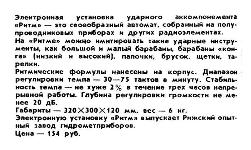 Электронная установка ударного аккомпанемента "Ритм" выпускалась предположительно с 1982 года Рижским опытным заводом гидрометприборов. Назначение в проспекте.
