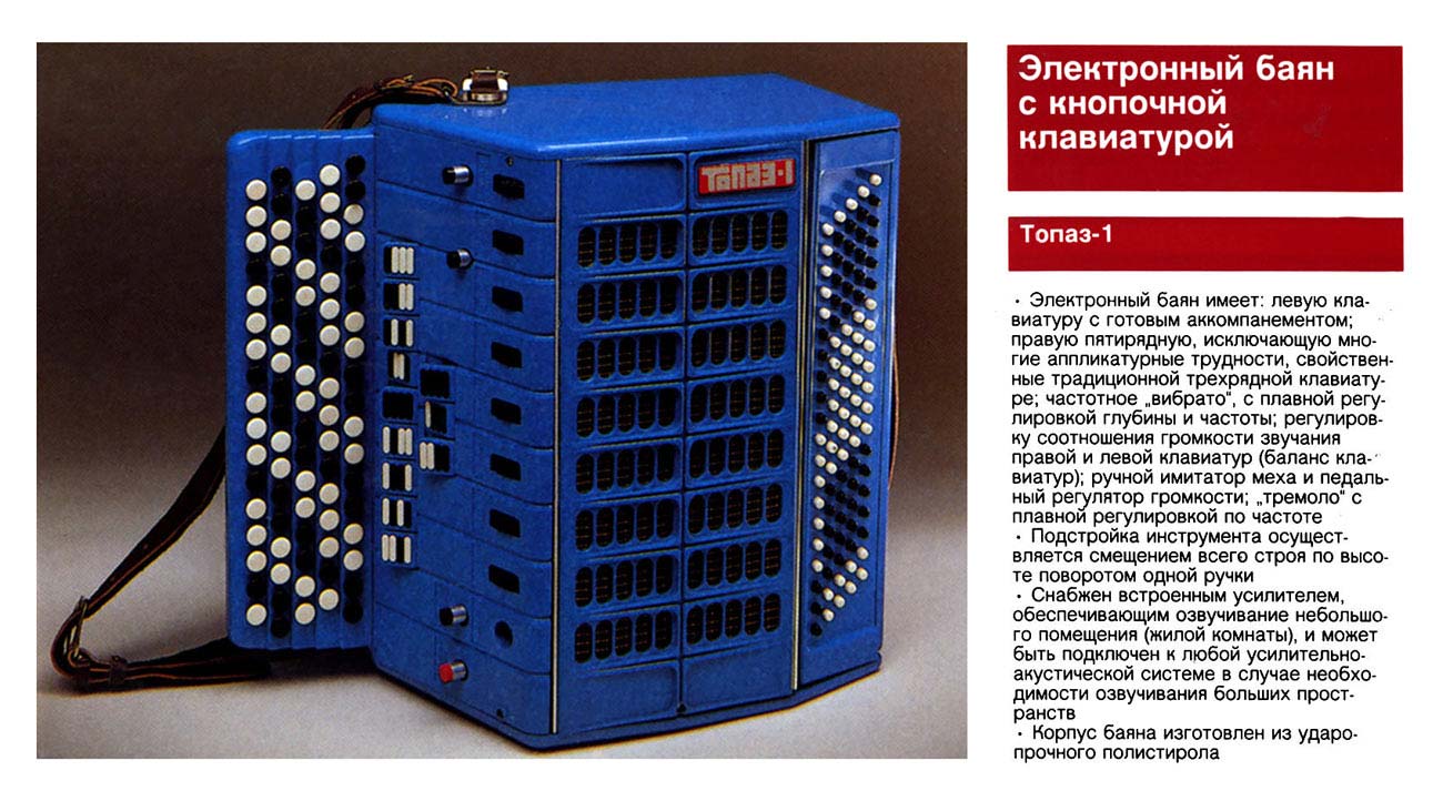 Электробаян "Топаз-1" выпускался с 1987 года Качканарским радиозаводом "Форманта". Служит для имитации звучания обычного баяна. Методом синтеза создаёт звуки органа, флейты и др.