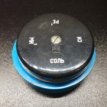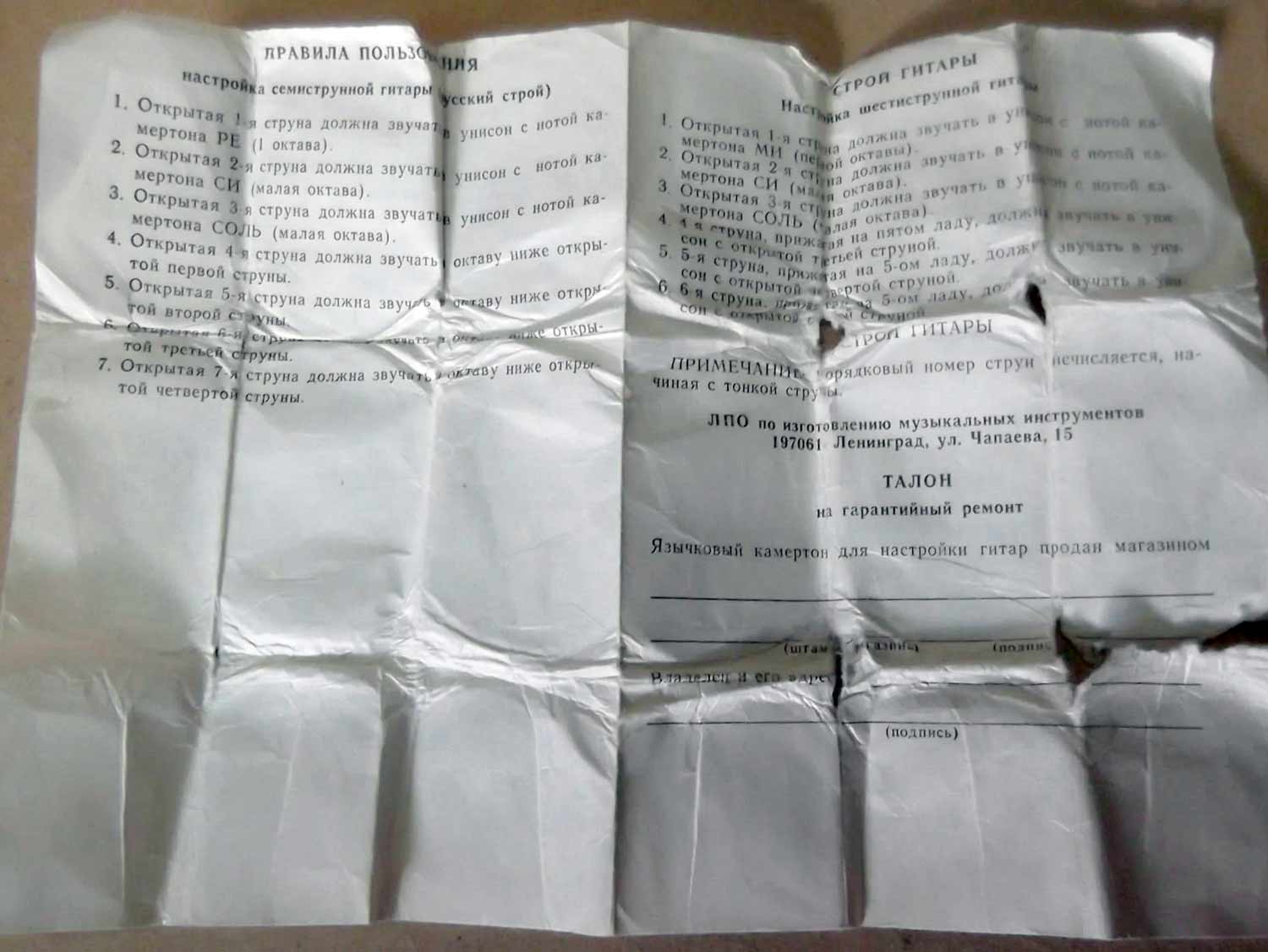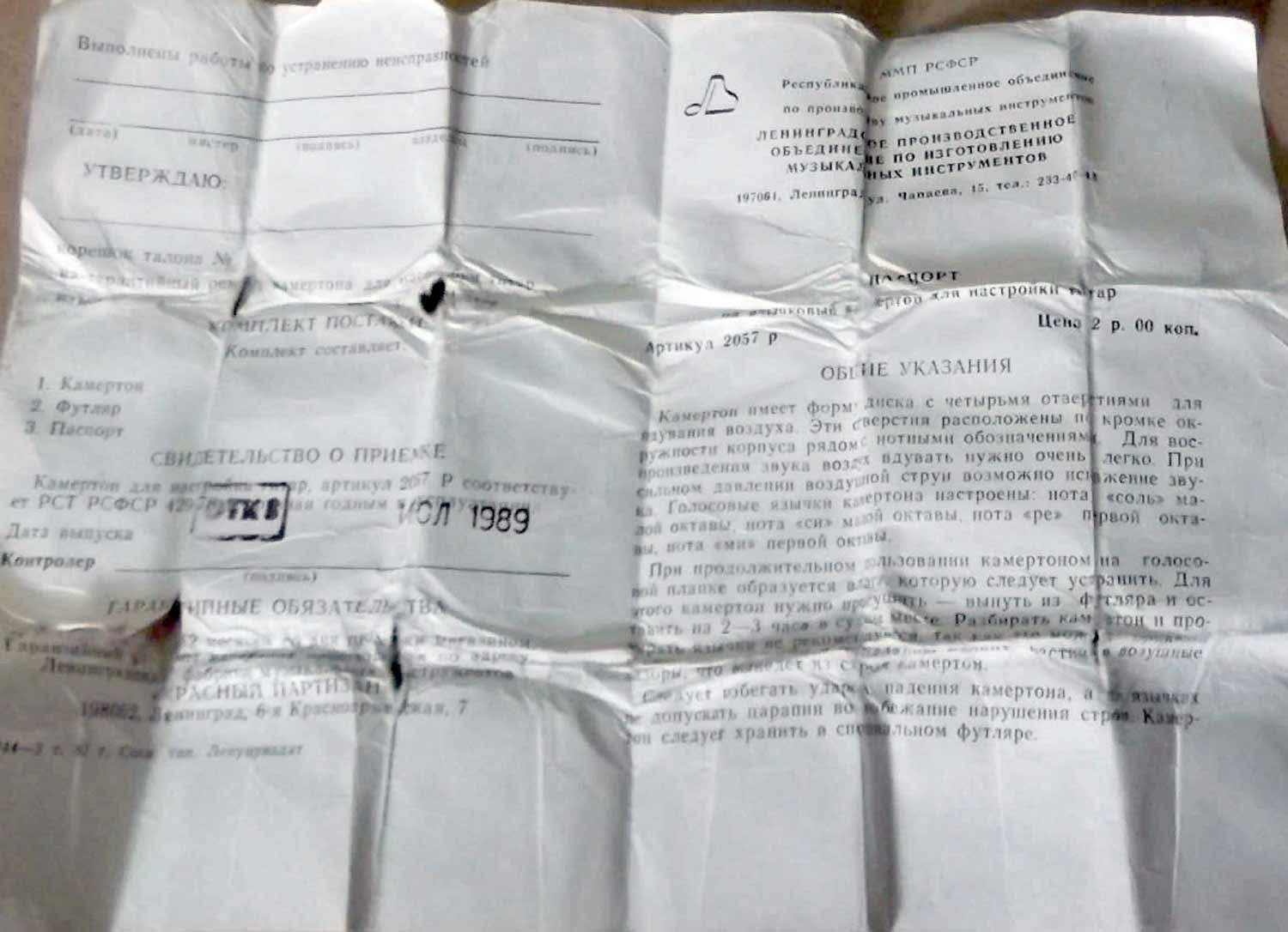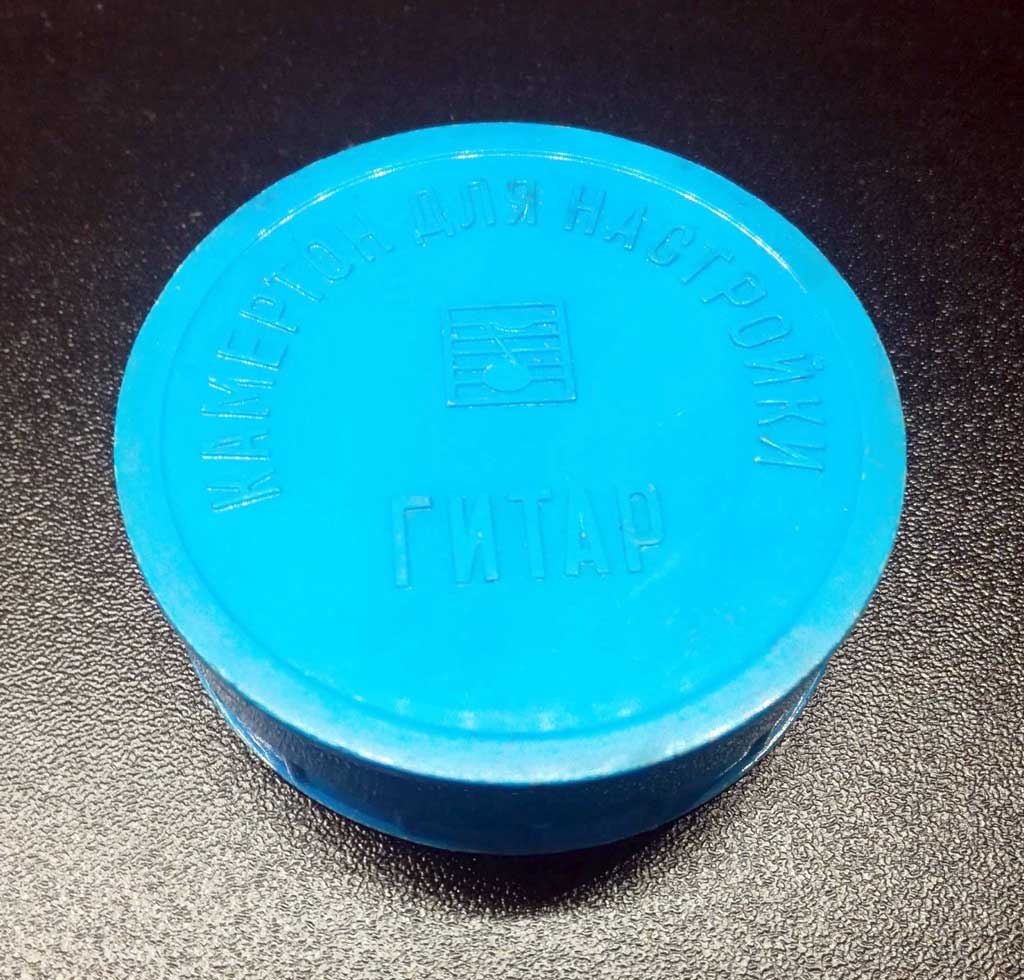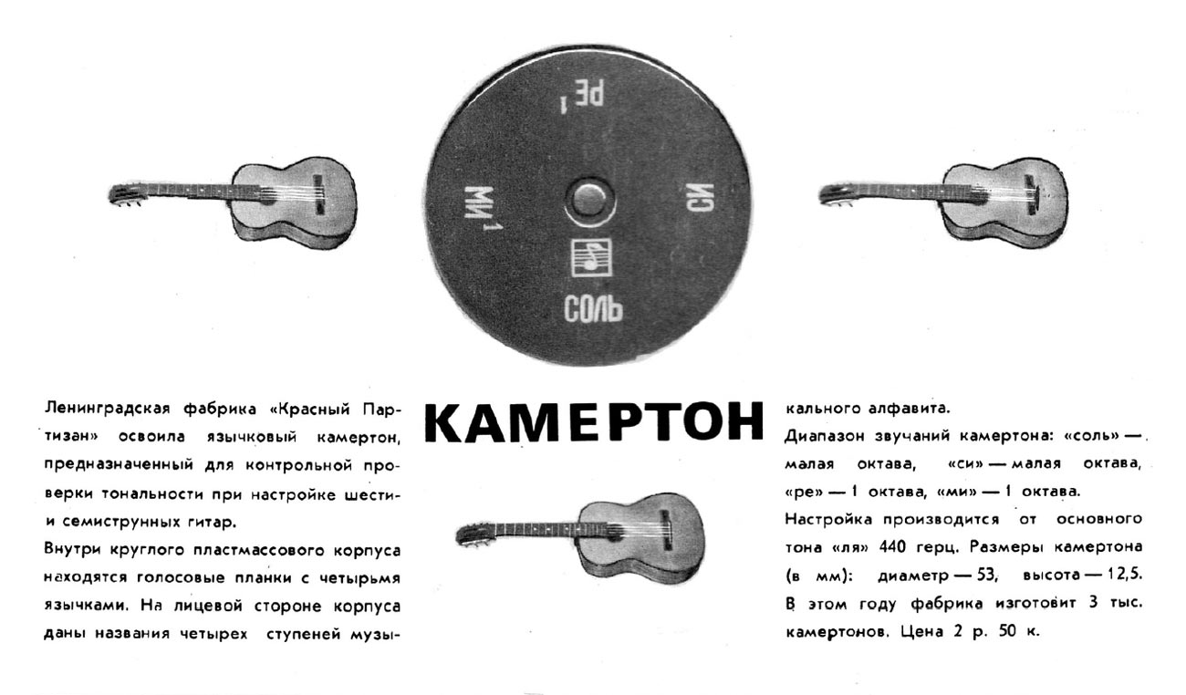 Язычковый камертон для настройки гитар с 1970 года выпускала Ленинградская фабрика "Красный Партизан". Служит для настройки 6-ти и 7-ми струнных гитар.