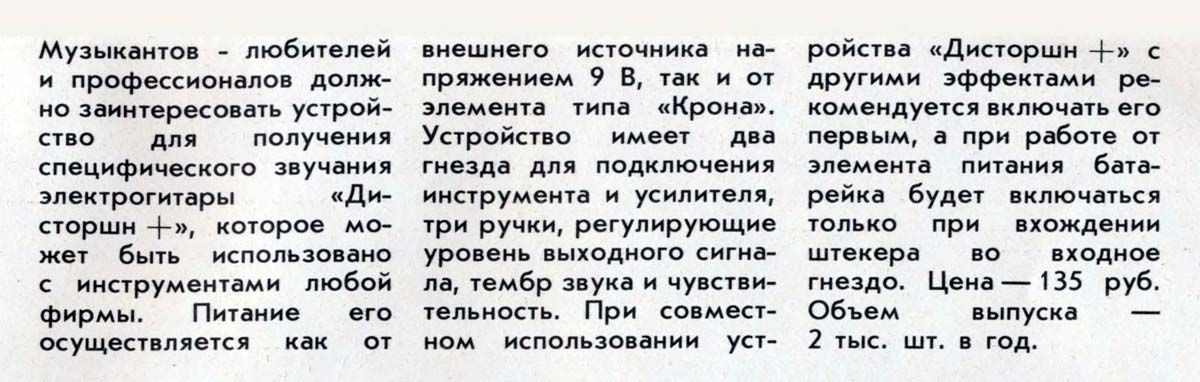 Устройство "Дисторшн +" подготовлено к выпуску с 1990 года неустановленным предприятием. Рекламный проспект опубликован ЦКРО "Электроника" в журнале "Новые товары" № 11 за 1889 год.
