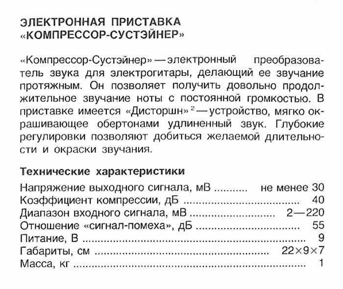 Электронная педальная приставка "Компрессор-Сустэйнер" выпускалась возможно с 1983 года. Электронный преобразователь звука гитары.
