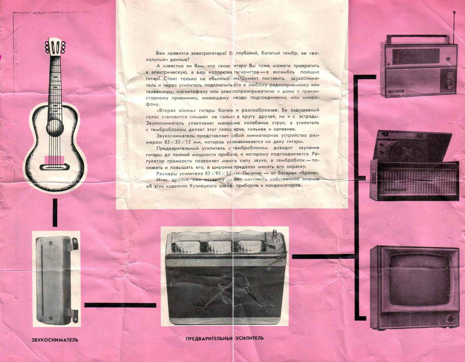 Предварительный усилитель для электрогитары выпускался с 1972 года Кузнецким заводом приборов и конденсаторов (Пензенская область). Предусилитель с темброблоком. Инструкция.