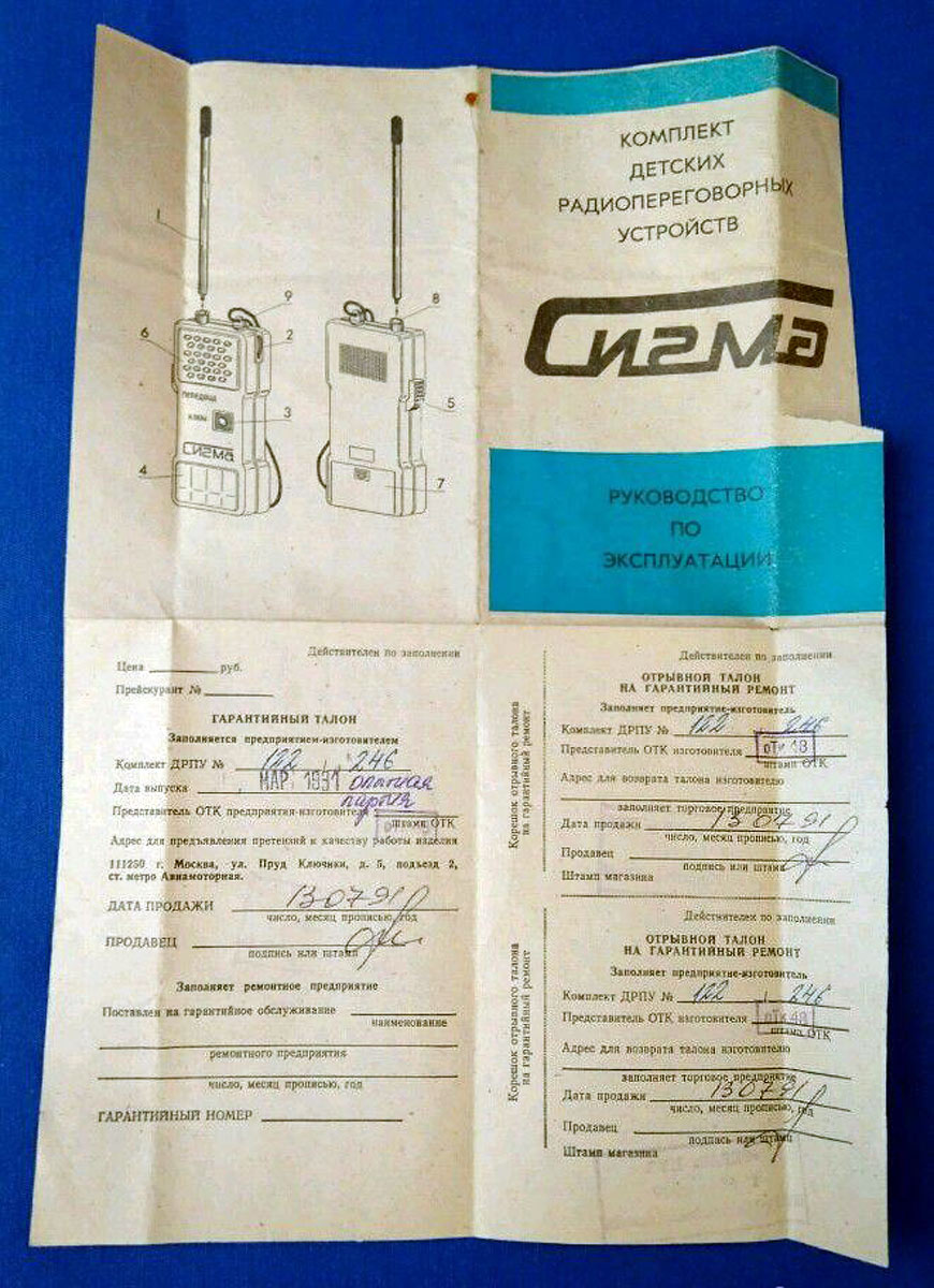 Комплект детских радиопереговорных устройств "СИГМА" выпускался с 1991 года на одном из Московских заводов. Подробнее о РПУ в визуальной инструкции.