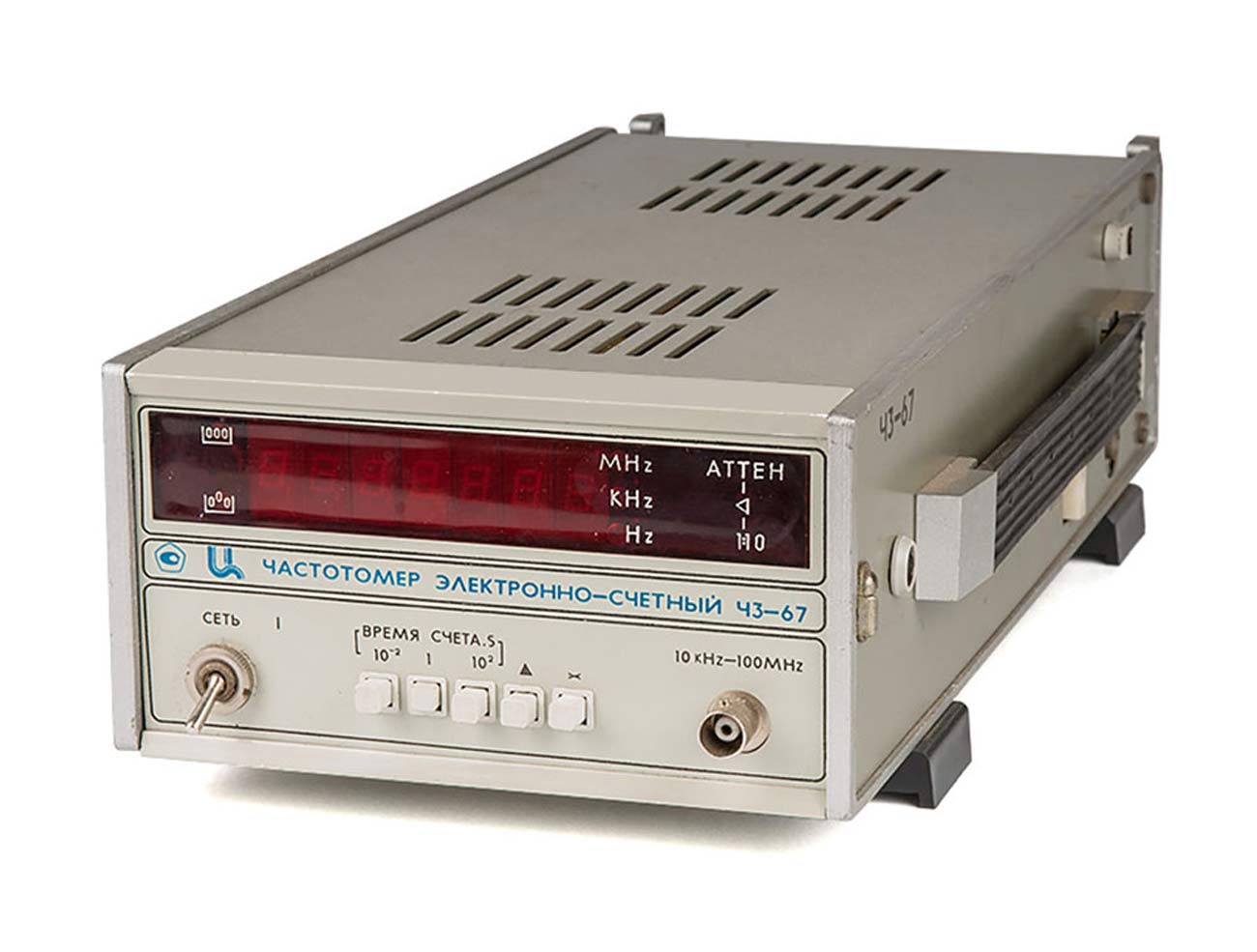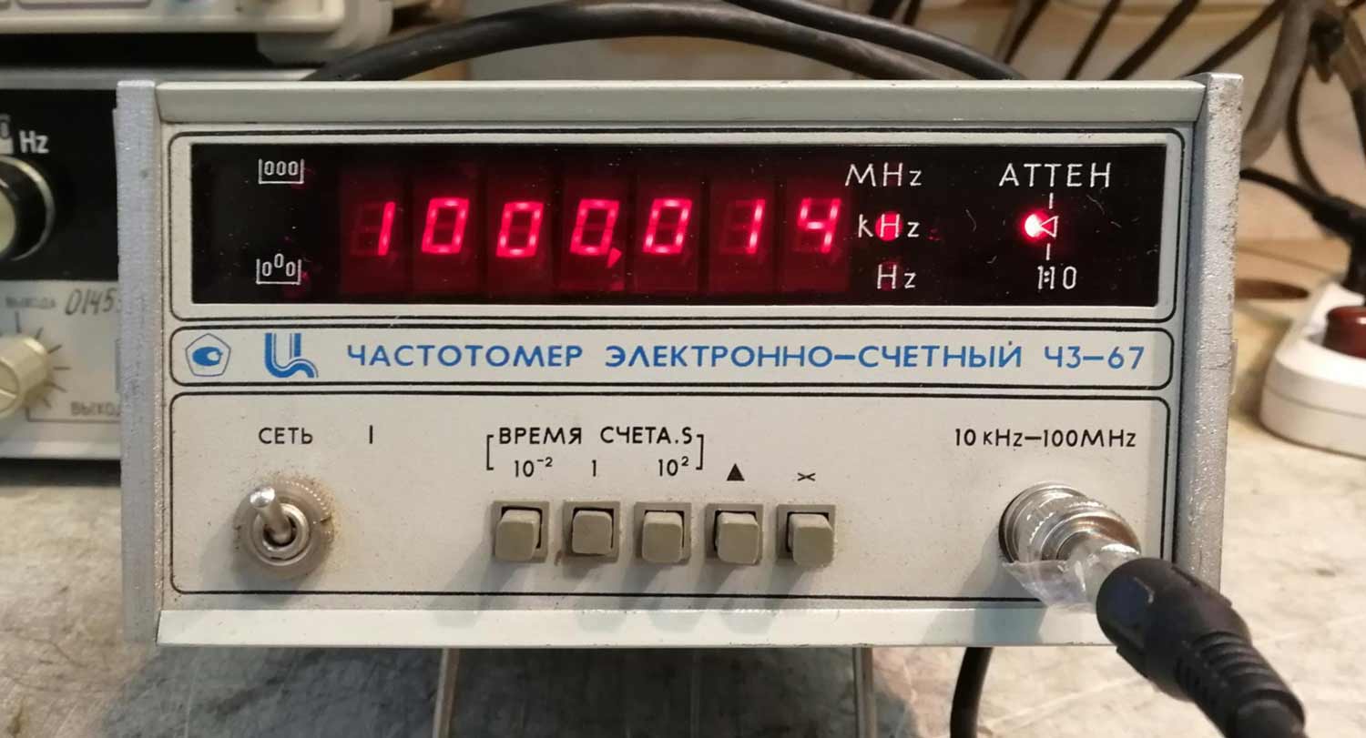 Частотомер электронно-счётный "Ч3-67" производился предположительно с 1989 года Абовянским заводом "Измеритель". Предназначен для измерения частоты до 100 МГц и выдачи сигнала опорной частоты.