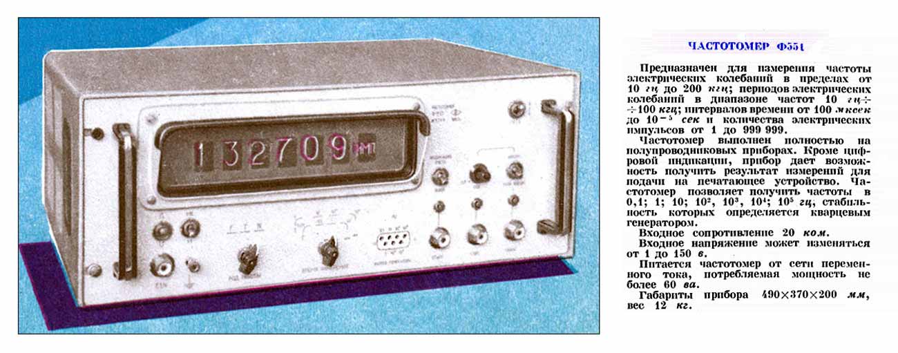 Электронно-счётный частотомер "Ф551" разработан в 1973 году. Предназначен для измерения частоты от 10 Гц до 200 кГц.