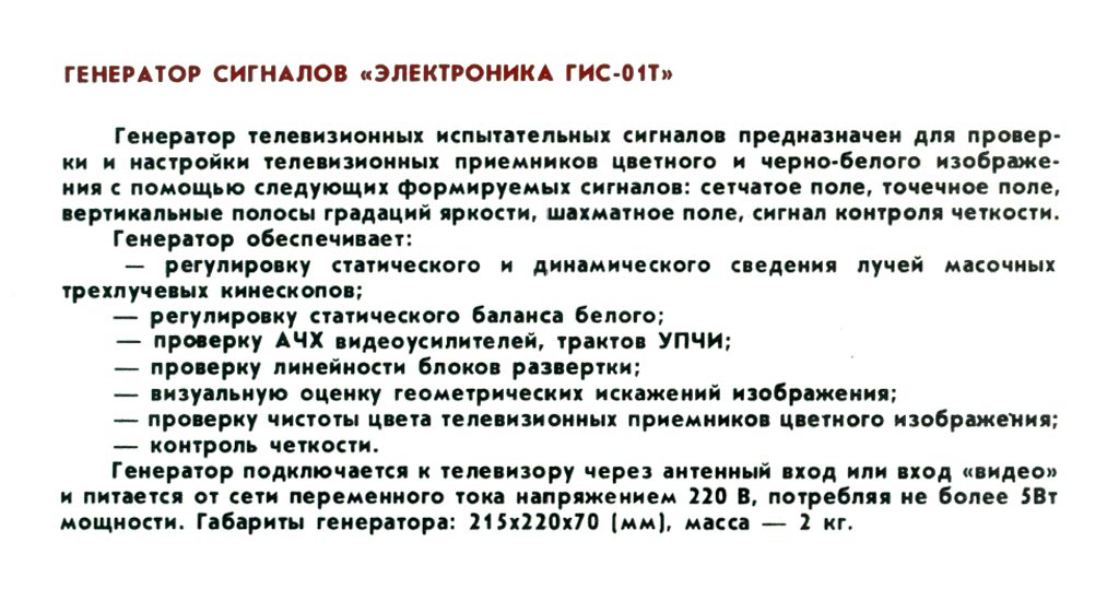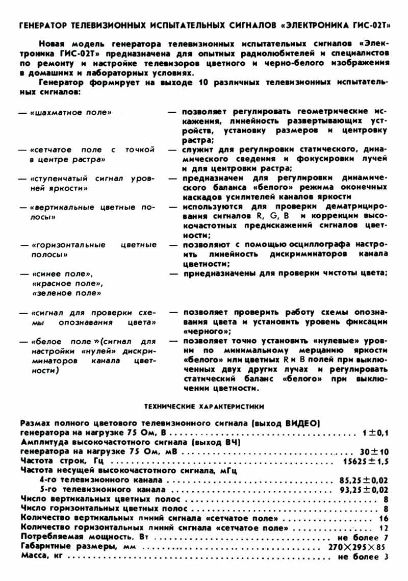 для настройки цветных и ч/б ТВ приёмников при их ремонте или налаживании.