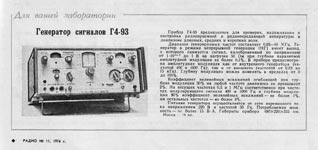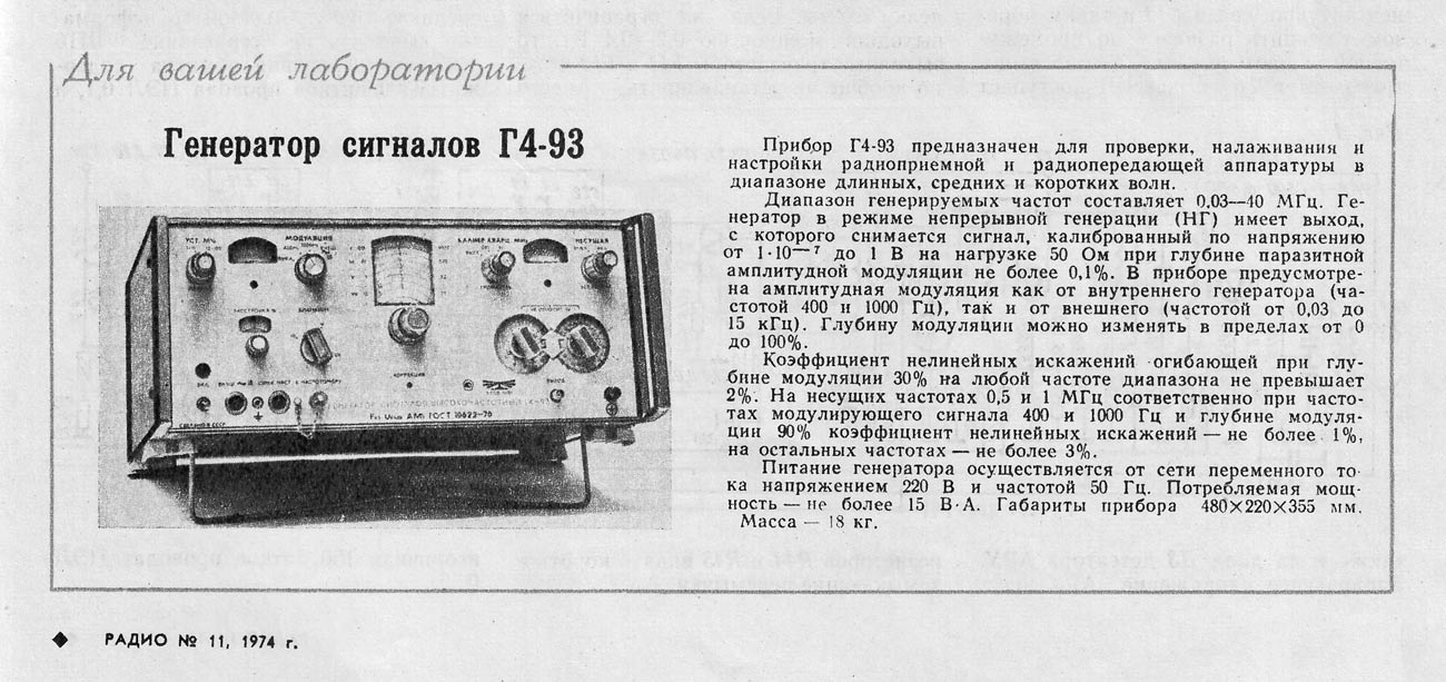 Генератор сигналов "Г4-93" выпускался с 1972 года. Предназначен для контроля, проверки и настройки разной приёмо-передающей аппаратуры работающей в диапазоне от 30 КГц до 40 МГц (реально от 100 КГц д 50 МГц.