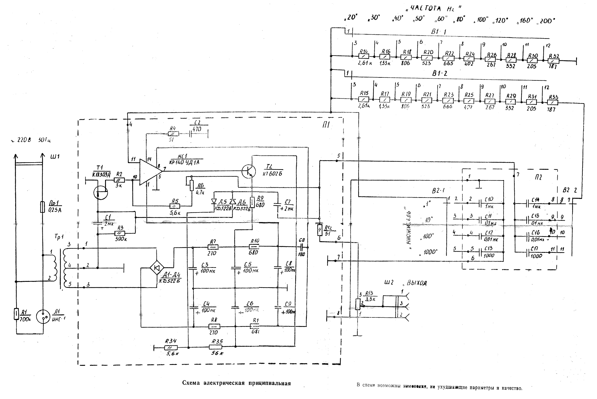при нагрузке 600 Ом - 0,5 В. Питание сеть ~ 220 В.