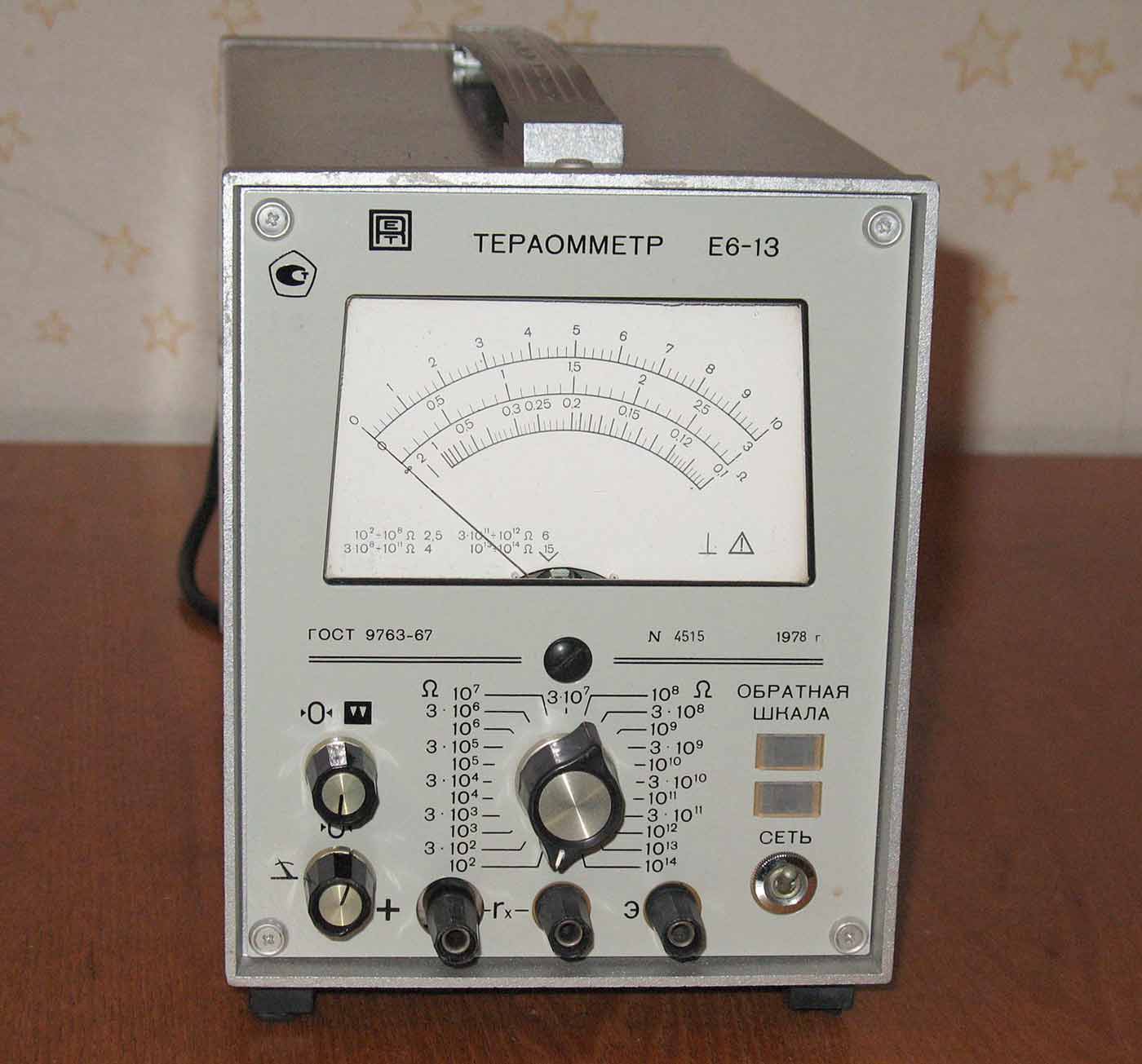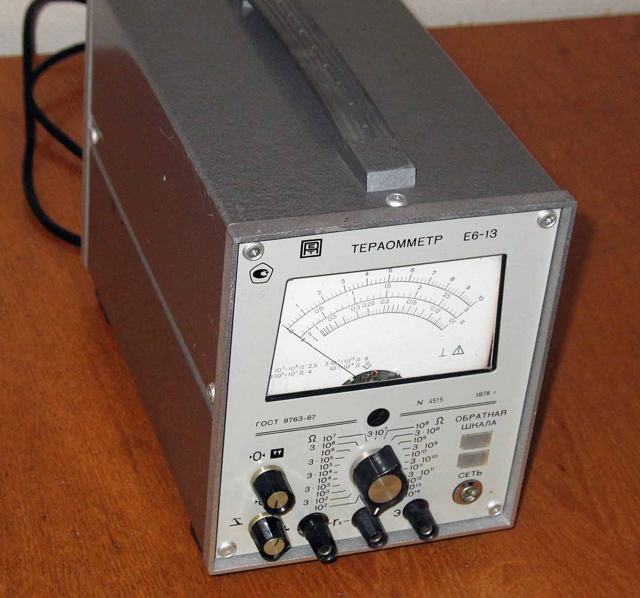 Тераомметр "Е6-13" предположительно с 1976 года выпускал Таллинский завод "Пунане РЭТ". Для измерения сопротивления постоянному току. Параметры прибора в госреестре.