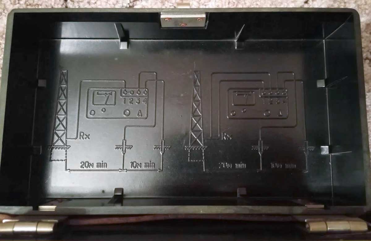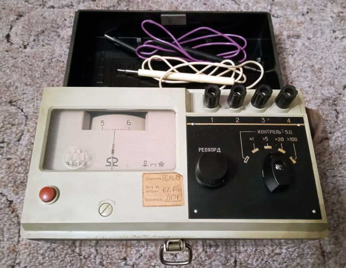 Измеритель сопротивления заземления "М-416" производился предположительно с 1974 года. Прибор предназначен для измерения сопротивления заземляющих устройств. Предел измерения от 0,1 до 1000 Ом.