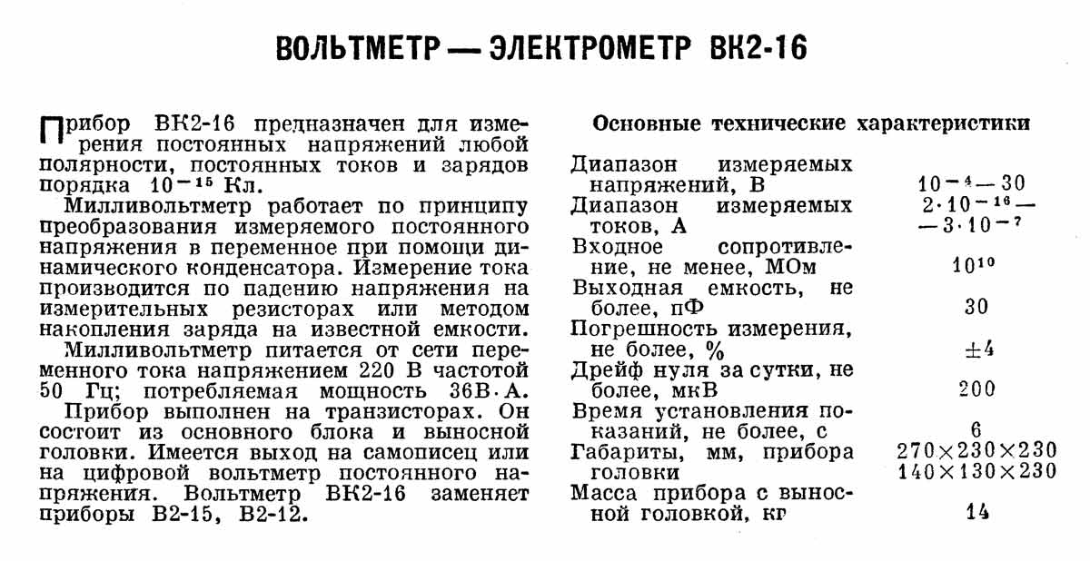 Вольтметр электрометрический "ВК2-16" выпускался возможно с 1974 года. Служит для измерения постоянных напряжений, токов и зарядов. Более подробное описание в выпуске Госстандарта.
