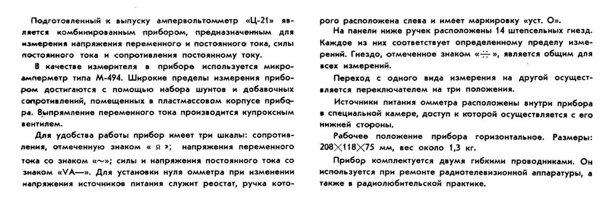 Комбинированный прибор "Ц-21" (ампервольтомметр) подготовлен к выпуску с 1958 года Омским заводом "Электроточприбор". Планировалось что он станет заменой популярного ампервольтомметра "Ц-20".
