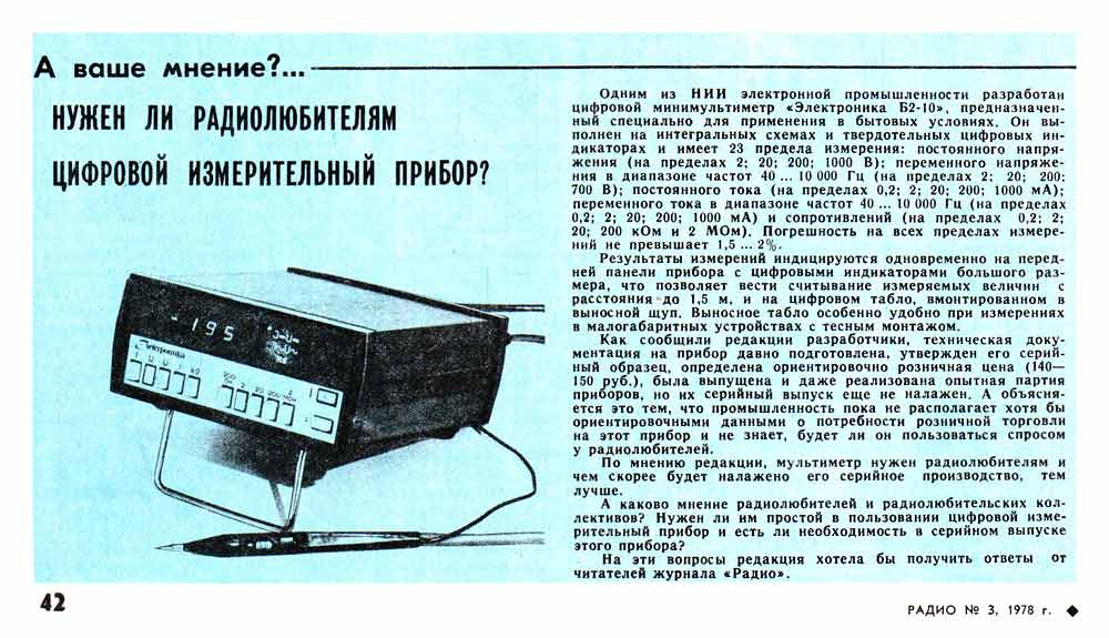 Бытовой минимультиметр "Электроника Б2-10" выпущен опытной партией в 1977 году. Подробности о минимультиметре - ниже, в журнале Радио № 3 за 1978 год.