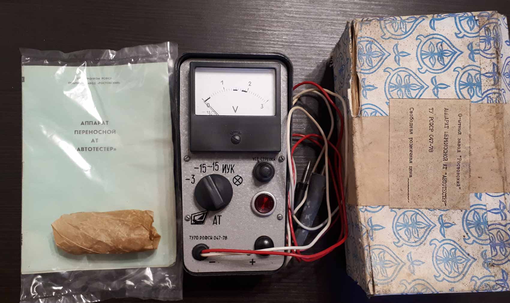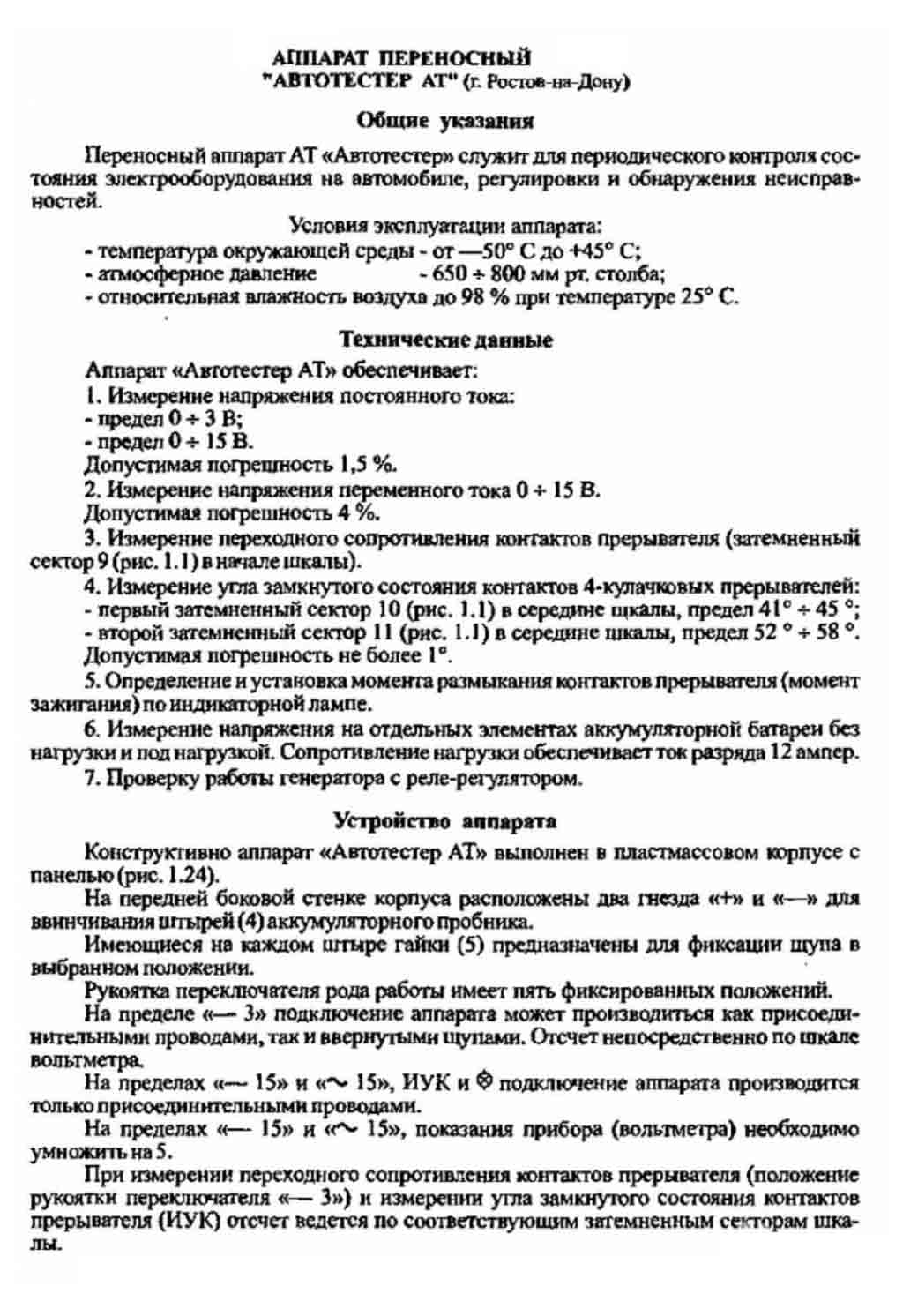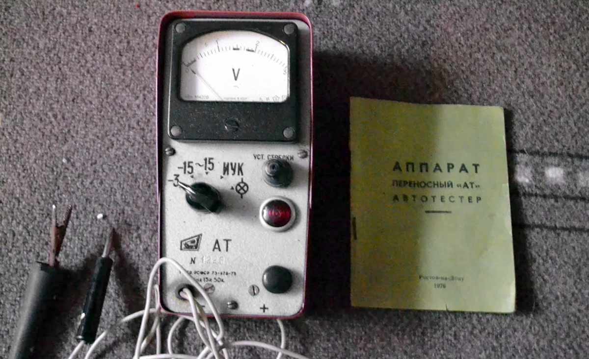 Аппарат переносной "Автотестер АТ" с 1975 года выпускал Опытный завод "Ростовский". Служит для контроля электрооборудования автомобилей.