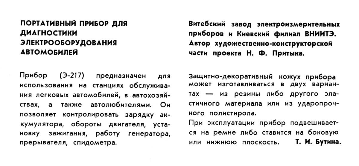 Портативный прибор для диагностики электрооборудования автомобилей "Э-217" разработан во ВНИТЭ в 1975 году. Информация в журнале "Техническая эстетика" № 3, 4 за 1976 год.