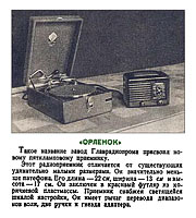 Малогабаритный радиоприёмник "Орлёнок" с 1941 года выпускал один из заводов Главрадиопрома. Коротко о модели в рекламном проспекте.