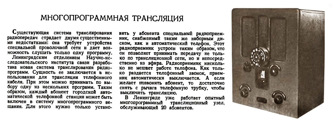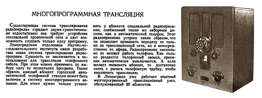 Радиоприёмник "Радиофон" разработан в Ленинградском НИИ в 1939 году. Это комбинированное устройство многопрограммного радиоприёмника и телефона.