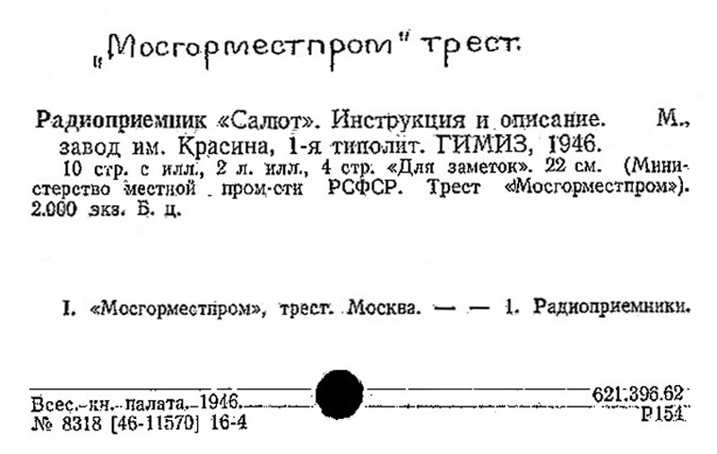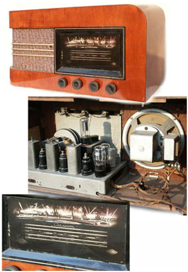 "Салют" с 1946 года выпускал Московский радиозавод имени Красина. Это пятиламповый