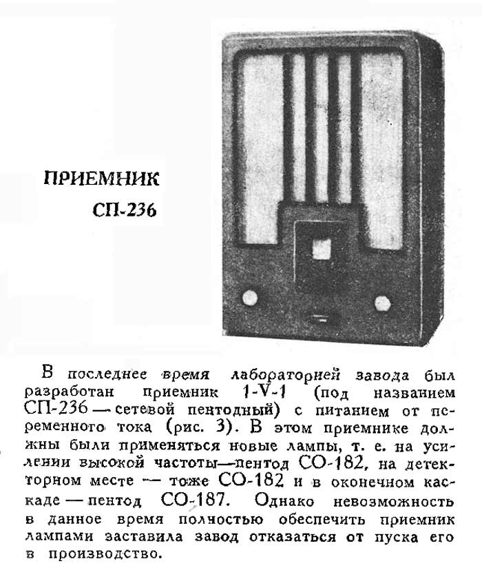 от пуска его в серию. Вместо него лабораторией завода совместно с бригадой ЦРЛ был разработан радиоприёмник "СИ-236", который с начала июля 1936 года пошёл в производство.