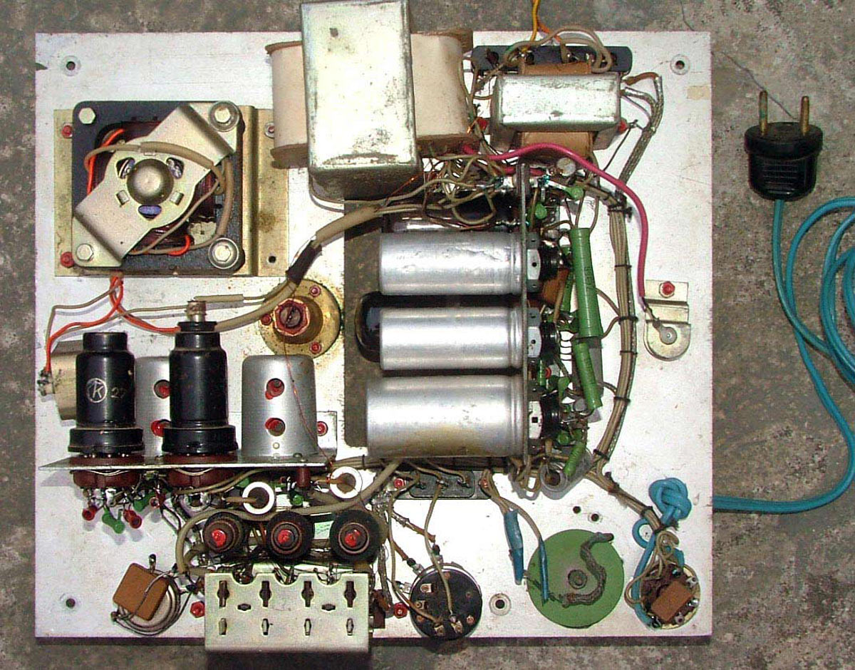 на лампах 6А7, 6Б8С, 6Н9С, 6П6С, в выпрямителе работает лампа 6Ц5С. В качестве