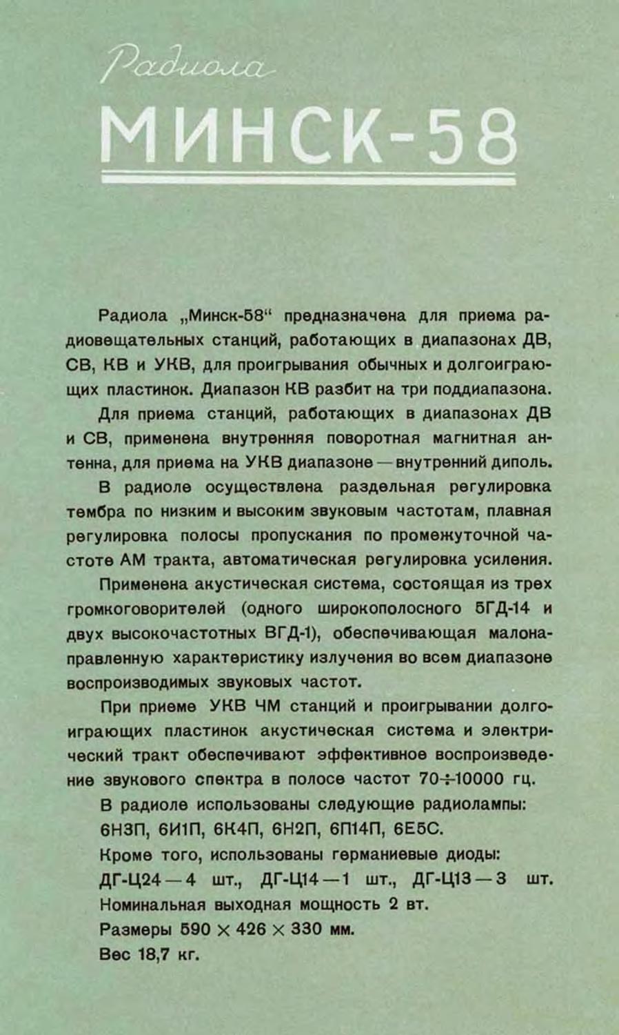 Радиола ''Минск-58'' предназначена для приёма радиовещательных станций,
