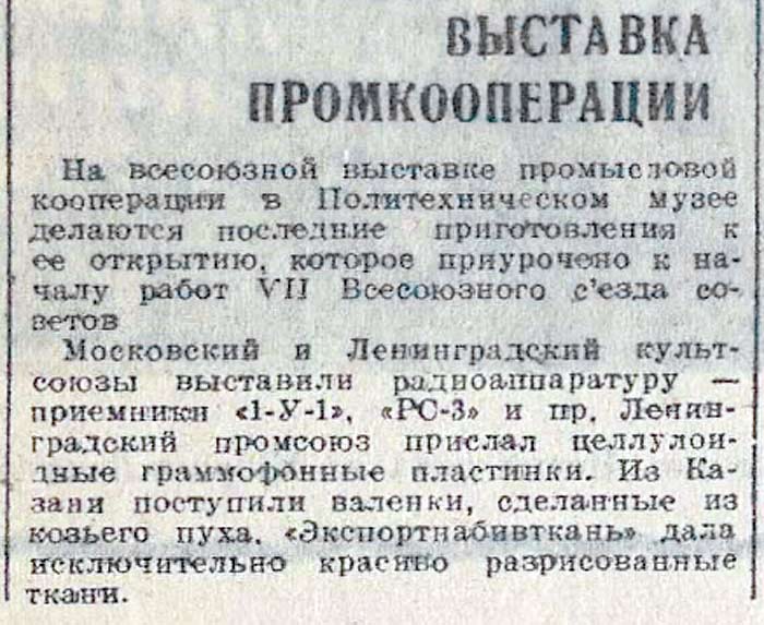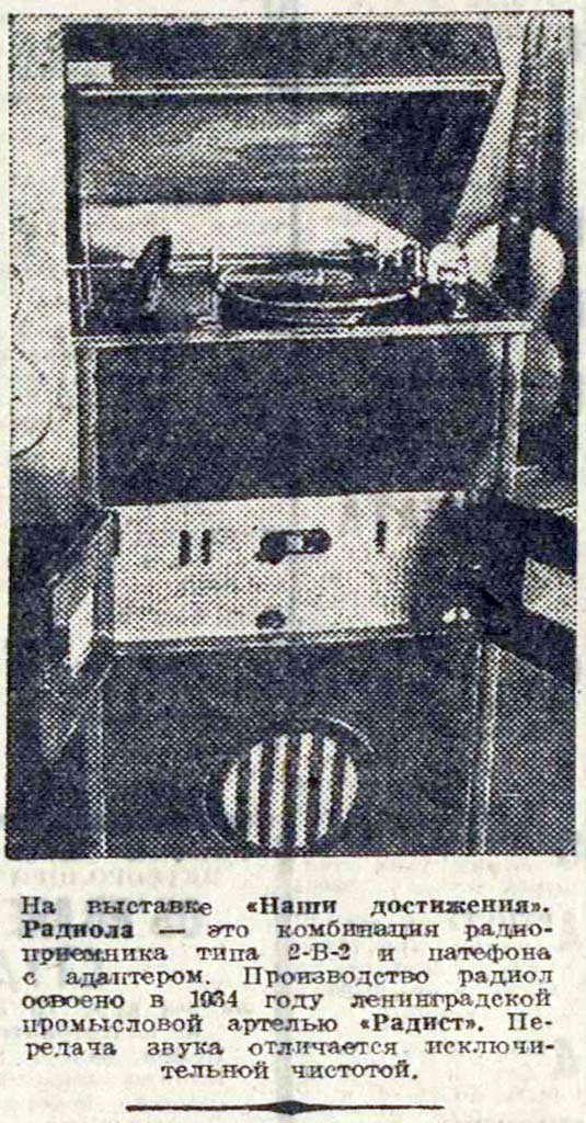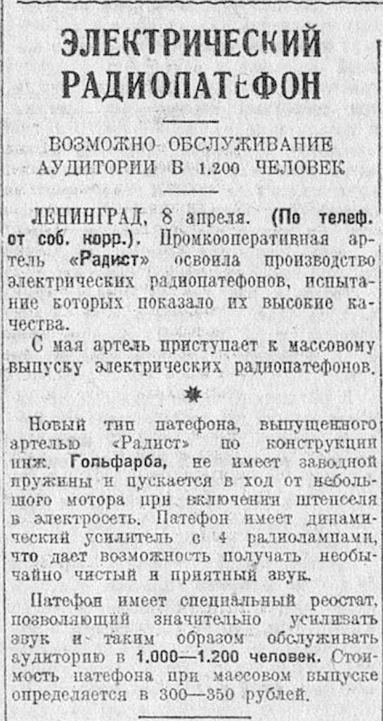о радиоле в газете "Вечерняя Москва" от 9.04.1934 года, от 15.10.1934 года